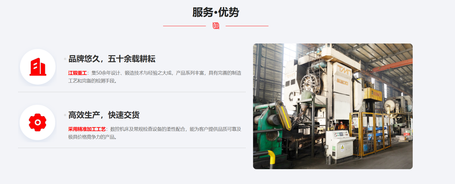 江西江锻重工有限公司是在原国有军工企业——江西锻压厂改制基础上于2006年5月组建成立,位于江西省分宜县城东工业园,员工200余人,属国家级专精特新小巨人企业、国家高新技术企业、江西省“专精特新”中小企业、江西省专业化小巨人企业、江西省民营科技企业、安全生产标准化三级企业。