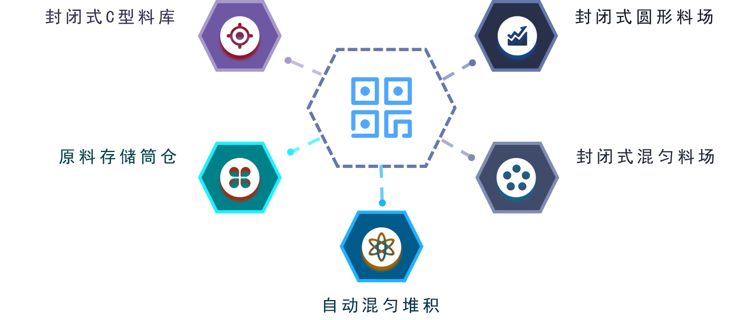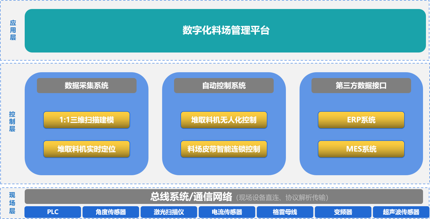 无人化料场系统各模块间通过生产指令、生产基础数据以及生产过程数据的实时共享交互,并与外部系统进行必要的数据通讯,实现各子系统及模块间的有机高效协作,从而最终打造一个高效、智能的原料场智能物流集中管控系统。